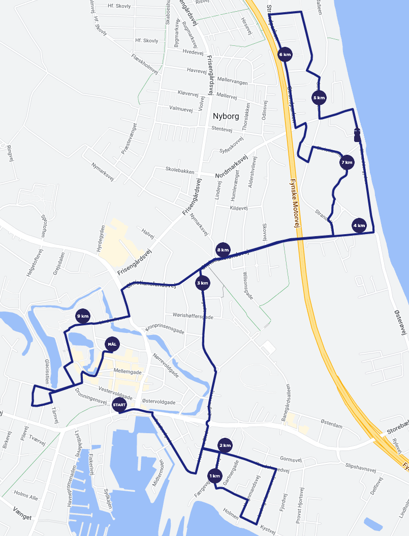 Herefter gik ruterne mod nord, hvor 10 km-løberne blev sendt helt ud til kysten og løb et stykke langs vandet med Storebæltsbroen på højre side og senere gennem Christianslundsskoven.